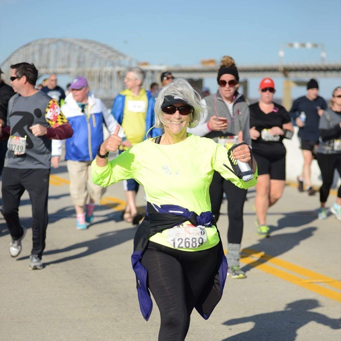 One race I have really fond memories of is the two times I did the Naylor Mill 7K, On the Bacon Trail. The first time, I was super slow and Colette Outten and Sabine Boggs stayed with me and swept me in as a thunderstorm broke overhead. The volunteers in the pouring rain put their arms up for a finish line, and some members of my running club, Kent Island Running Group, had waited for me and jumped out of their cars to cheer my finish. Wow! The next year, I trained with Kate James and cut almost half an hour off my time. I fell a few times, but finished in time to get bacon. Epic!