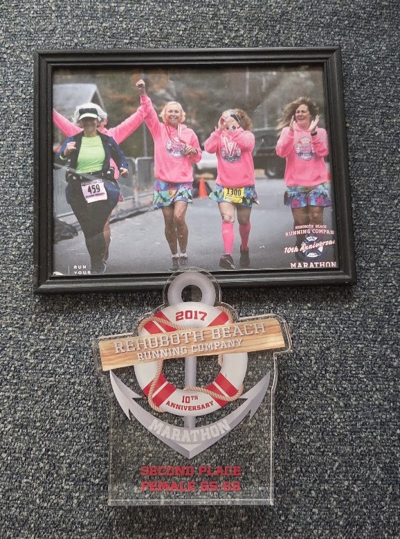 As part of my weight loss journey, I started walking every day and eventually tried the Couch to 5K program. As an older runner (I was 61 when I started), and with some breath issues, I continue to use run-walk intervals. I did my first 5K at Adkins Arboretum, and another at Horn Point. So my first two races were trail races! My first 10K was the Across the Bay bridge run in 2014. I wasn’t sure I could make it up the bridge, but by 2015, I did it again and enjoyed it. I then started to do half marathons. My first was the Delaware Running Festival. Next, I traveled to Indiana for the ShePower half. I selected it because not only did it have my mantra on the shirts – She believed she could so she did – but it also had my spirit animal, the dragonfly, symbol of transformation. Also, it has the best medal. In 2017, I did my one and only marathon, the Rehoboth Seashore Marathon. That was awesome. It took me a little over 7 hours to finish and they were already taking down the cones, but the pink ladies were waiting and ran me to the finish line. I will always remember this! It took a few months to recover. Since then I have returned for the Rehoboth half every year except for Covid.