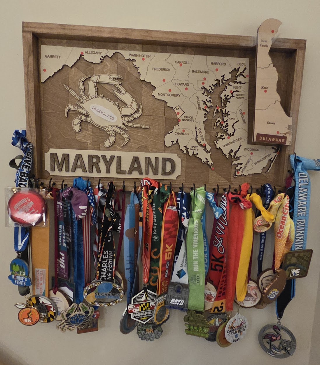 I had fun with a wooden “Maryland” board from Etsy. Each time I got home from a race, I added a red dot to the location on the board. I added an Etsy Delaware piece, and carved a little DC piece and glued it in. We put cup hooks on the bottom to hang the medals. There were several races that didn’t have medals, so I made my own.